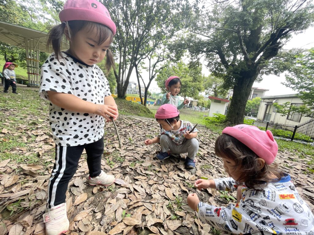 どんぐり公園で一生懸命ガサゴソ🔍みんなそれぞれ気に入ったどんぐりや木の棒を持っています🤭お友だちと「あったねえ!😲」と言いながら一緒に探す姿が可愛いです💕