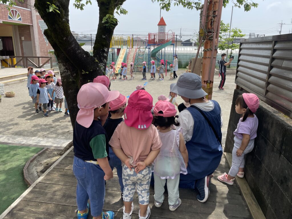 運動会の行進練習をジーッと眺めるうさぎ組さん👀たくさん見て予習中のようです😁