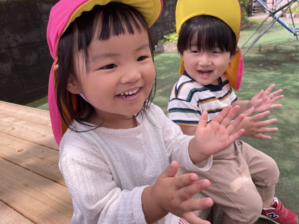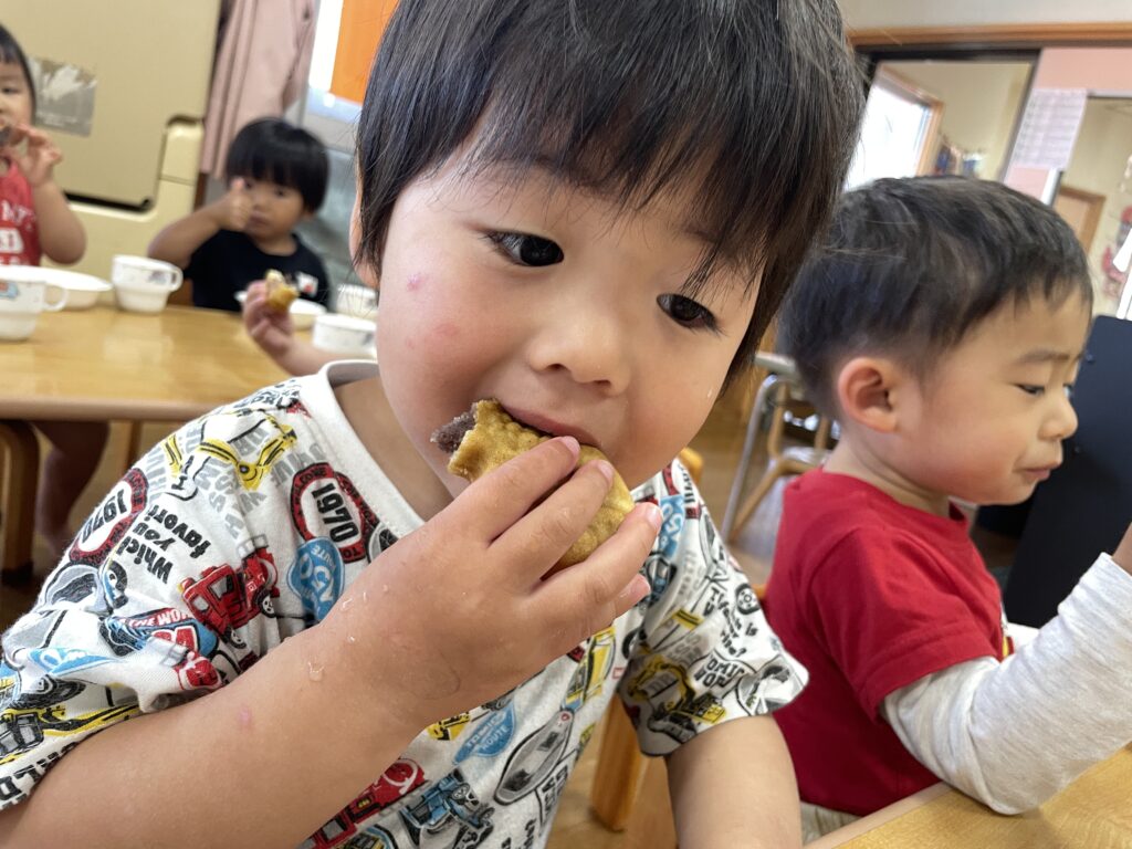 5月のお誕生日メニュー🎉おやつはたい焼きでした!お昼寝から起きるBGMに“およげ!たいやきくん”を流す先生…🐟「たいやき?」「たいやきってなにー?😲」と不思議そうでしたが、たい焼きを見て「うわあ!お魚だー!😆」と喜んでいた子ども達です✨写真の後ろではグッドしている子もいますね😁👍