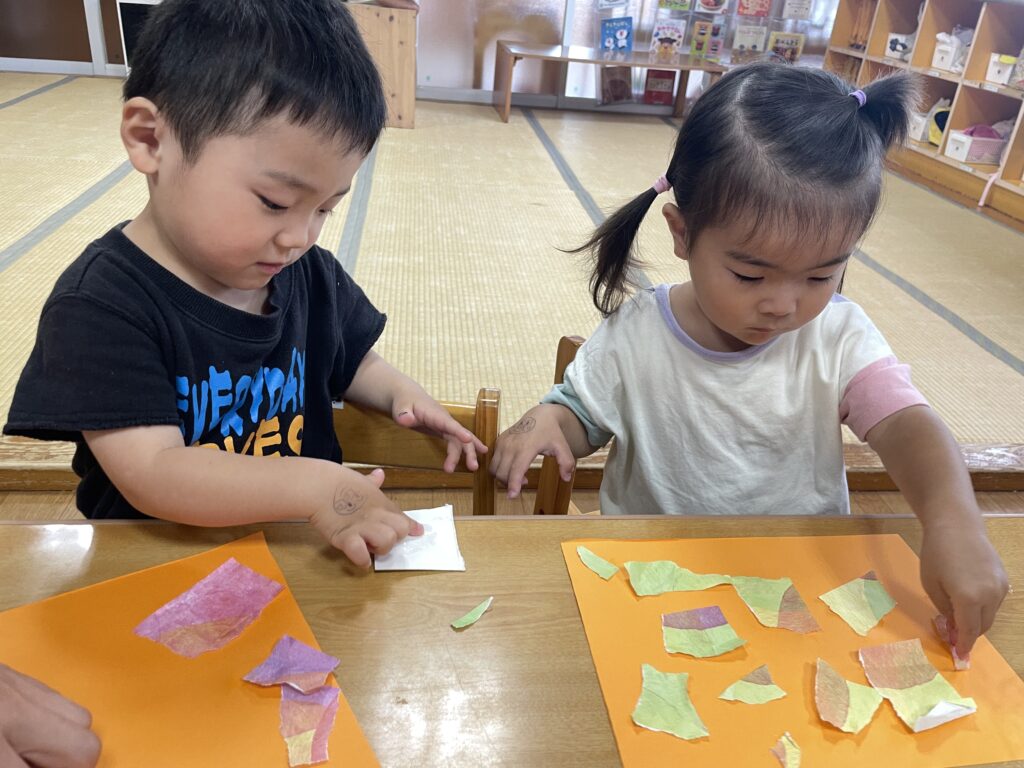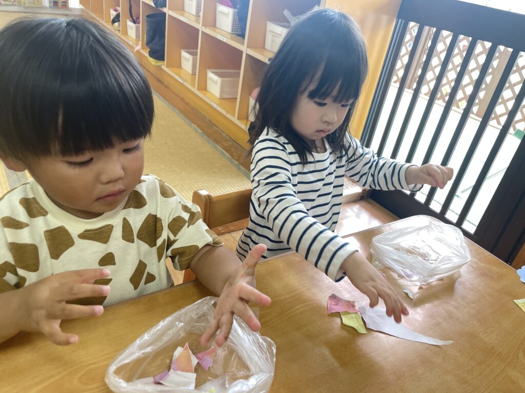 5月の製作遊びでは折り紙をちぎって、でんぷん糊で画用紙に貼り付けました🌈新しいことに苦戦しながらも集中して遊んでいましたよ👏折り紙を何枚もちぎったり、画用紙に隙間なくたくさん貼り付けたりとみんな楽しんでいました😊糊やハサミなど、成長したからこそ使える道具をつかって製作遊びも楽しんでいきたいと思います✂️