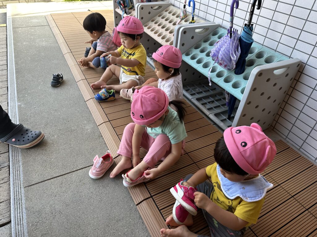 「お外に行くよー!」と声をかけると、帽子を取りに来て、自分のお靴を取るという流れが身に付いてきました!お靴も自分で履こうと頑張っていますよ😄