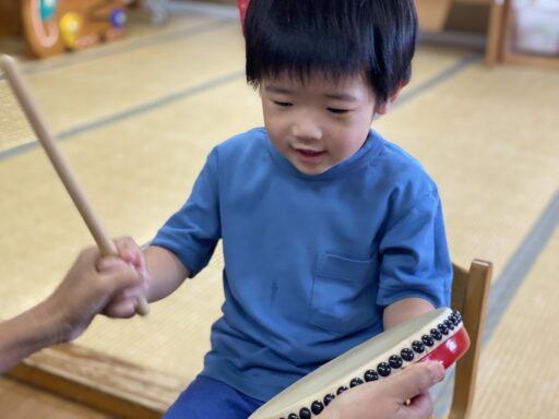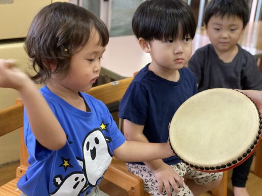 子どもたちは、タンバリン・カスタネット・鈴・マラカスの楽器に興味津々🎵お友だちと交代しながら、いろんな楽器で「山の音楽家」「おもちゃのチャチャチャ」の曲を合奏して楽しみましたよ😍中には、マラカスをマイクにして歌う子どももおり、楽しく楽器に触れることができました😄また、沖縄の伝統楽器『パーランクー』を体験した子どもたちは、パーランクーを持って踊ってみたいと好奇心旺盛です✨今月は、MYパーランクー作りをしたり、エイサーの曲に合わせて踊ってみたりしたいと思います😍
