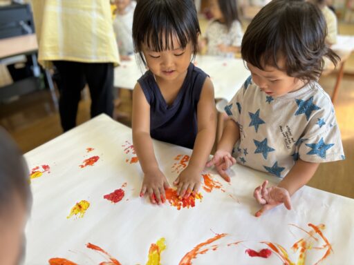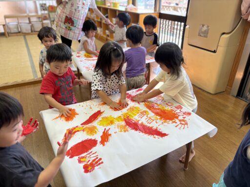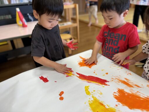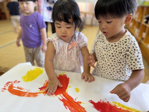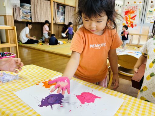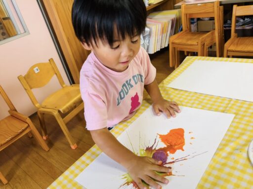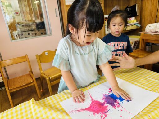 ティッシュに絵の具をふくませて、画用紙の上で思い切り…ベチャッ‼︎🖐️新しい取り組みにも興味津々だった子どもたち💕慎重にギュ〜っと潰す子や、絵の具が床まで飛ぶほど思いっきり叩き潰す子など、みんなそれぞれのやり方が見られ面白かったです🤭✨色々なことを経験しながらこれからもたくさん楽しんでいきたいと思います🎶