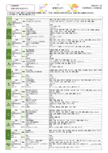 令和6年11月 給食だより LINE 2024.11.012025.05.08 11月29日(金) 11月28日(木) 11月27日(水) 11月26日(火) 11月25日(月) 11月21日(木) 11月19日(火) 11月18日(月) 11月15日(金) 11月14日(木) 11月13日(水) 11月12日(火) 11月11日(月) 11月8日(金) 11月7日(木) 11月6日(水) 11月5日(火) 11月1日(金)
