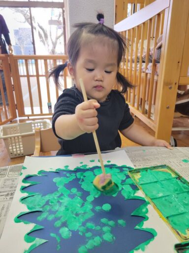 紅葉の制作とおなじようにクリスマスツリー制作をしました。みんなタンポでのポンポンが上手でかわいいツリー✨🎄✨ができました。