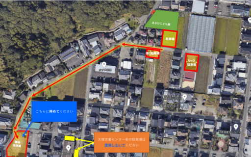 当日は、第1駐車場(保護者駐車場)、あさひこども園リーフの駐車場、大塚児童センター横駐車場をご利用ください。