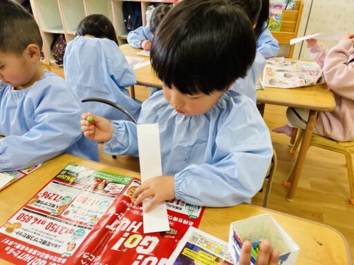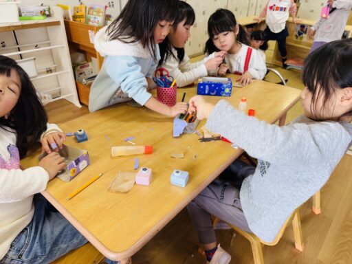 最近の自由遊びではトランプや塗り絵・工作にハマっている年長さん♪♪工作では作りたいもののイメージを膨らませながら黙々と制作に取り組んでいます!作ったものを実際に使って遊んだりと遊びを発展させながら楽しんでいますよ😁✨