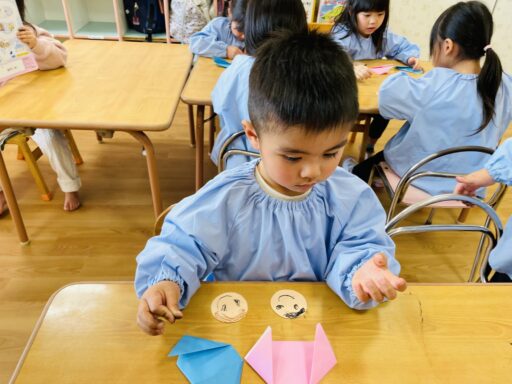 ひな祭り製作を行いました。雛壇は結婚式の様子が表されていることをお話しすると驚いていた年少さん。可愛いお姫様にしよう~♡とお雛様、お内裏様の表情にもこだわっていましたよ😊 ノリやハサミ、クレヨンなどお友達と順番に使えるようお話をするとお互い声を掛け合いながら交代して使うことができていました。完成品はくま組保育室に飾りますので、是非ご覧ください😌