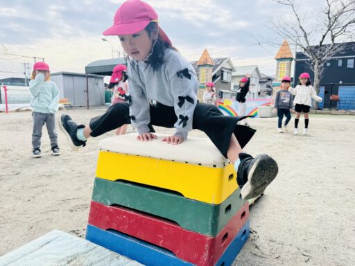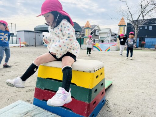 今月の運動遊びは跳び箱に挑戦しました!「高いなー、怖い、できるかな?」と不安はあったものの、4段も何事もなく跳んでいましたよ😊跳べるようになった子がお手本となり、並んでいる間に「こーしたらできるようになるよ」手の位置や飛び方を保育者のように教えてあげる姿も見られるようになりました🥹🥹