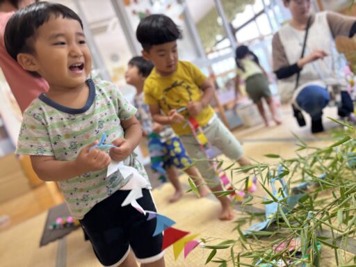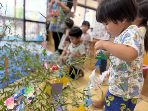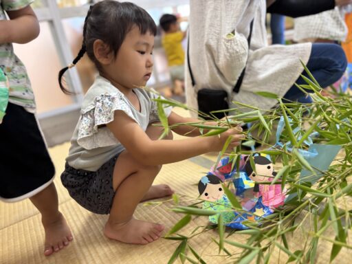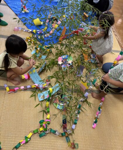 七夕の飾り付けをしました。竹がお部屋に運ばれてくると興味津々の子どもたち。