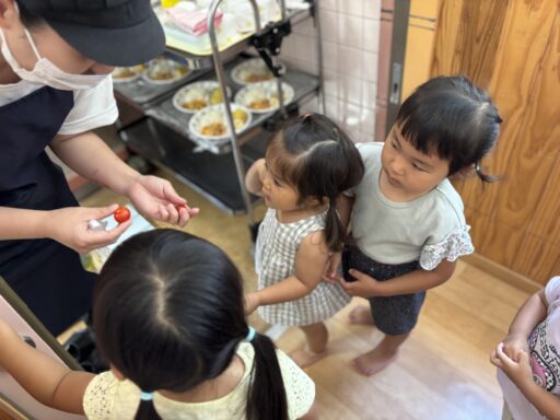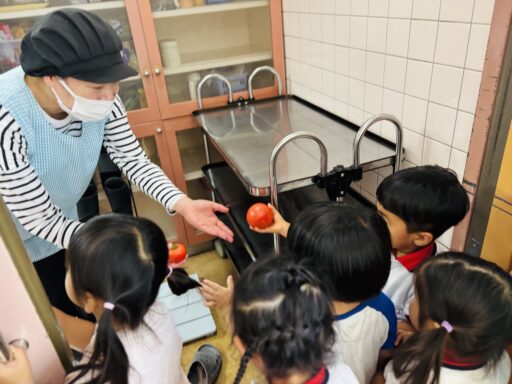 給食で収穫したトマトが出ると、「これうさぎさんのトマトー?」「おいしい!」と嬉しそうに食べています♪野菜が苦手な子も一口パクっと食べてみることが出来ていますよ✨食育にもたくさん体験出来るようしていきたいと思います💚