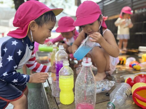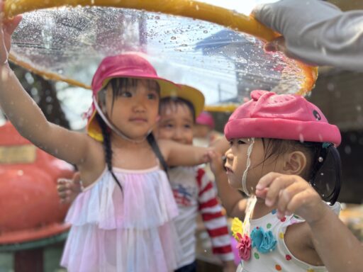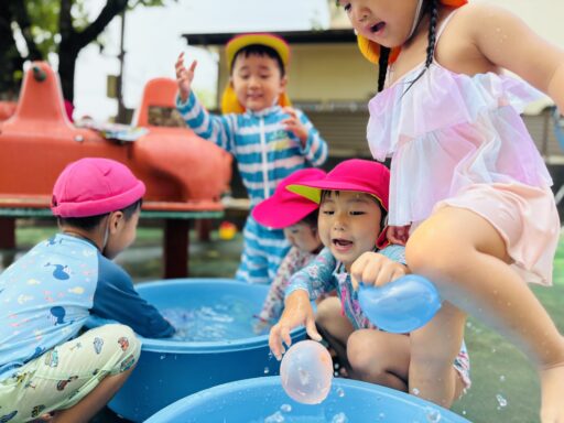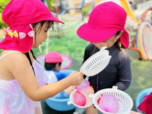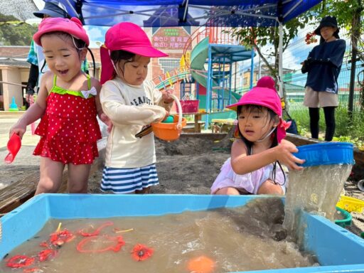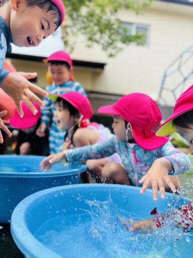 お天気が良い日は水遊びを楽しみました。みんな水遊びが大好きで、毎日楽しみにしていますよ🐰💕朝の会で水遊びの話をすると「やったあ!みずあそびだー」と嬉しそうな声が聞こえてきます。