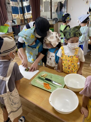 年長さんは収穫したナスを使ってみそ汁のクッキング保育を行い、普段はナスが苦手だという子も「自分で作ったから食べてみる!」と挑戦してくれたようです😊