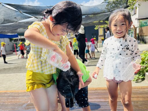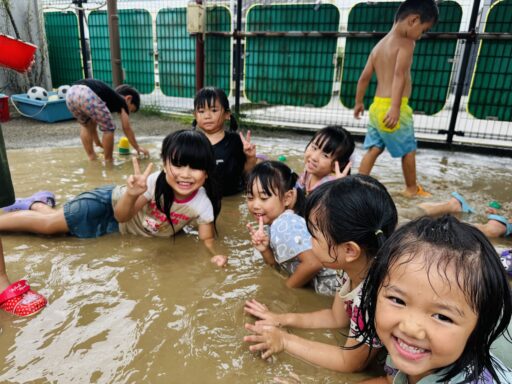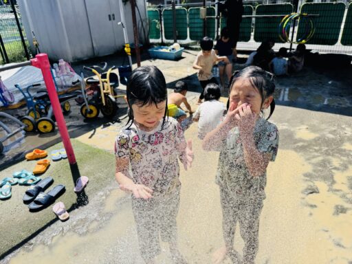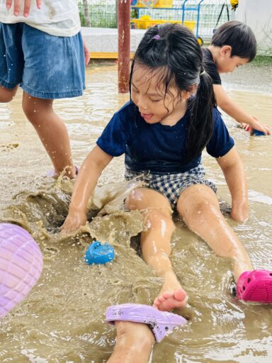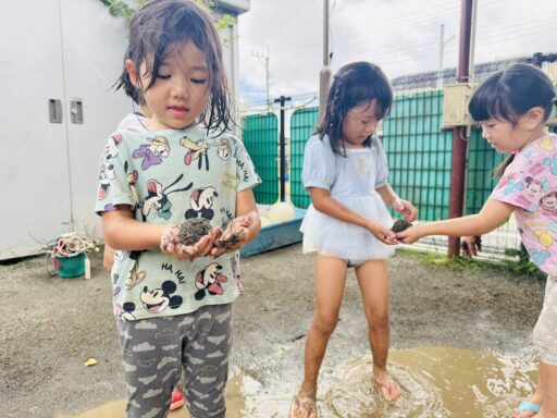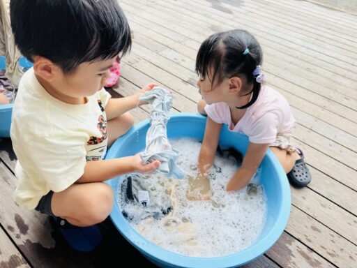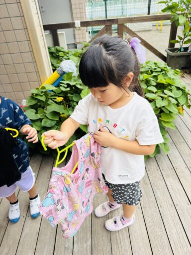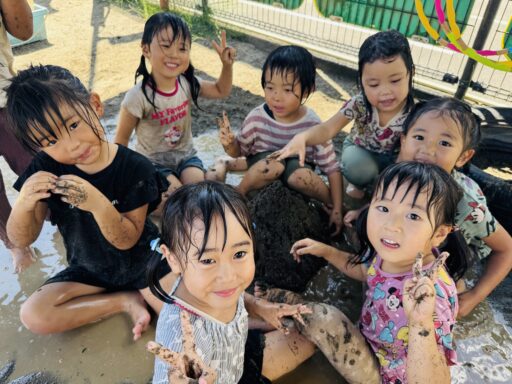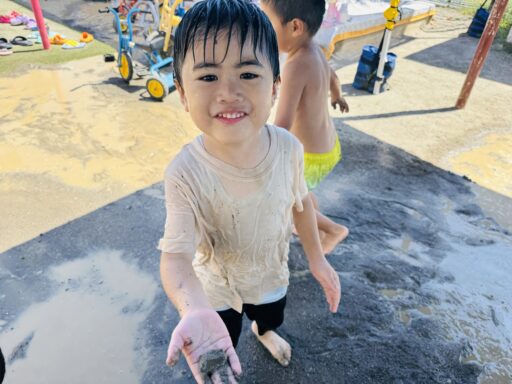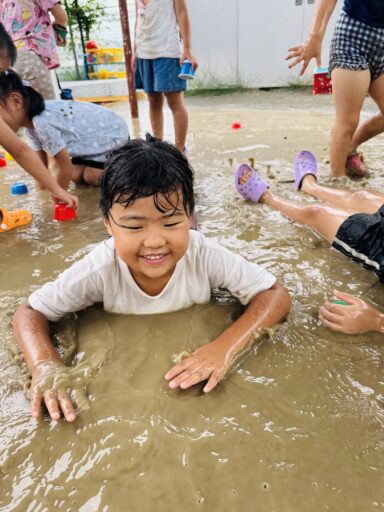 先月は抵抗あり、恐る恐る泥水に入る子どもたち😂今ではへっちゃらで泥んこ遊びとなると、着替えを10分以内で終えて大胆に飛び込んでいましたよ‼️回数を重ねるごとに、遊びも発展し先日にはみんなで協力し、お山を完成させました✨この期間で、お洗濯から干す事まで出来るようになった年中さん👏お家でも一緒にお手伝いしてみてください😊また、去年まで水が怖かった子も今では、顔や頭からかけられても喜んでおり、さらに自分で水をかぶるまでに‼️水遊びが大好きになりました❤️🚿そんな水遊びもとうとう8月29日で納めとなります…😭毎日ご準備頂き、ありがとうございました。泥んこ遊びの洋服もこの日にお返しいたします。9月からはマルシェに向け、商品作りに挑戦します✨