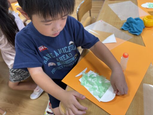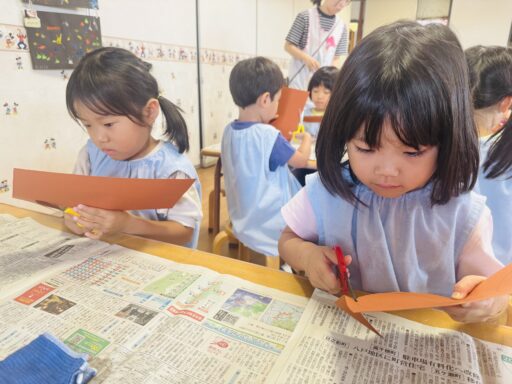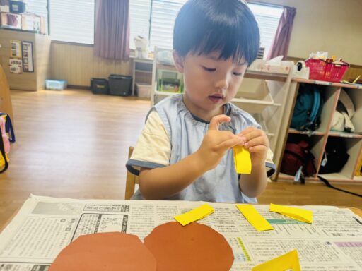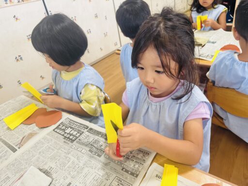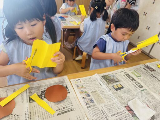 子ども達の提案もあり、今月は向日葵を作りました🌻まず、茶色の画用紙を丸く切り、向日葵の中心部分の管状花を作りました。線の上を切る事に慣れ、片手で紙を回しながら上手に切れてましたよ👏次は、線のない黄色画用紙を真っ直ぐに切り、花びらを作りました。線のない紙を切る事が初めての年中さん!!初めてとは思えないくらい綺麗な長方形を着る事が出来ました🥳その後は二つに折り、糊で貼っていきました。写真の通り全員最後まで集中し、お話もあまりせず黙々と取り組む事が出来ました👏✨