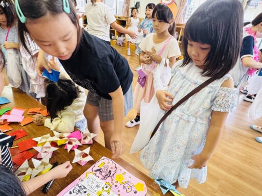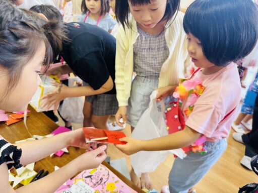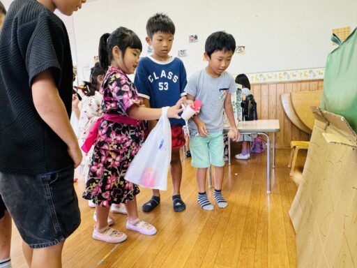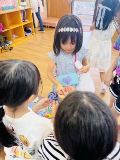 自分たちで作ったお財布、カバン、お面を身につけて、いざお買い物へ💖ゲームに、お菓子、アクセサリーなど、沢山の商品が子どもたちの心を高鳴らせていました✨おやつには、アイスクリーム🍨子どもたちにとって、とても楽しい一日になったことと思います😆