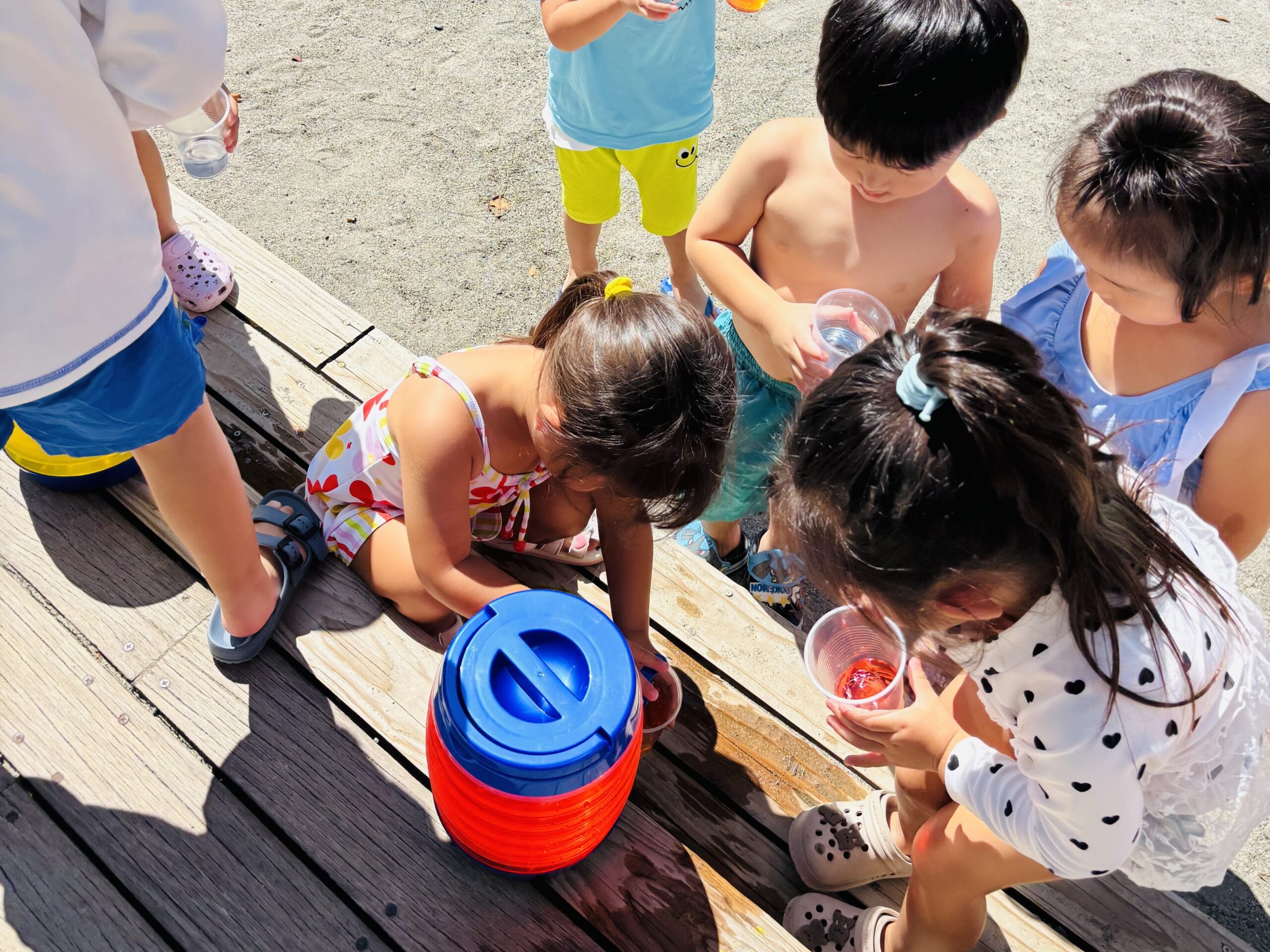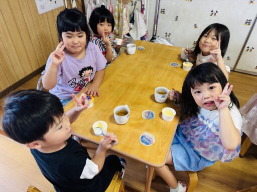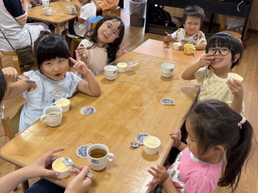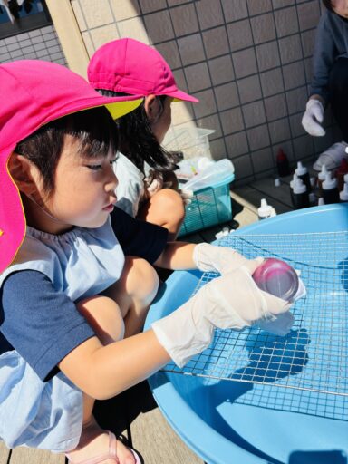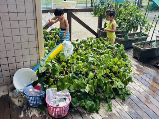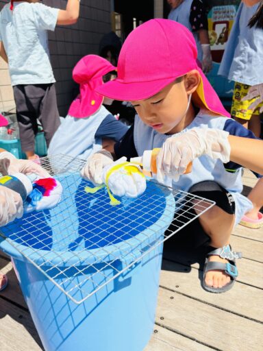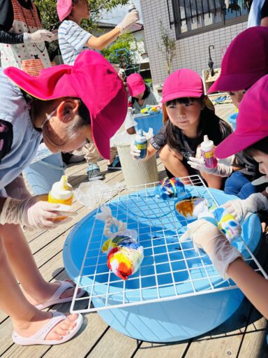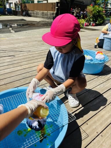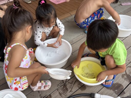 毎日の水あそびの中で、よく見られるのがごっこ遊び🍀色水あそびや氷あそびでも、「僕、氷屋さん」「私ジュース作ったよ」などと、お店屋さんごっこが、今の年少さんのブームのようです🥰