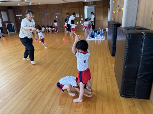 ぞうさんのポーズから、トンネルくぐりへ。そして、股くぐりを経て氷鬼での活用と、一つの動きからルールのあるあそびへの展開につながっています‼️子どもたちも、動きも段階を経るごとに、瞬時に考えて動くことができるようになり、新しいルールでの氷鬼も楽しんでいましたよ♪
