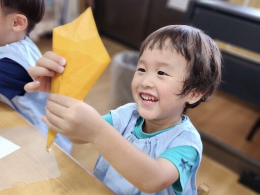 うさぎ組では、三角に折ることも難しかった年少さん。今回、先生に折り方を教えてもらいながら、自分で三角に折れるようになりました👏つまむ、ちぎるなどの指先をつかったあそびの中で、手指の発達が促されていることを感じられた製作あそびでした💖