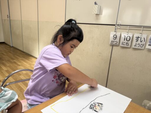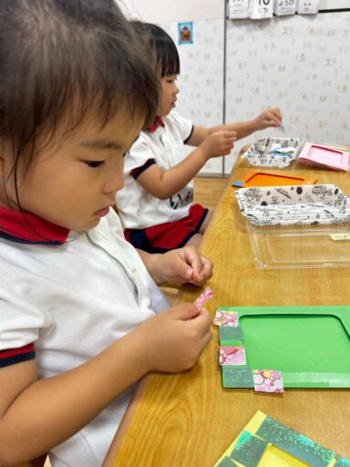 9月15日は敬老の日✨。子どもたちは、見本のフォトフレームを見て「僕も(私も)作る!」とやる気満々😊。久しぶりのハサミでしたが、線にそって折り紙を切ることができました✂️。フレームの縁に切った折り紙を貼り付け、完成を喜んでいましたよ🙌。