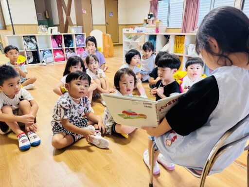 平仮名が読めるようになり、文字の多い絵本を好んで手に取る様子が見られるようになりました📕そこで、年長さんから「先生!絵本読んでもいい?」と空いてる時間に読み聞かせをしてくれるようになりました👏絵本の見せる姿勢や読み方も完璧で、保育者もビックリしました👀それを見て、時には年中・年少さんも一緒になって保育者と子ども役になり、お絵本の見せ合いごっこにハマっているこあら組です🐨