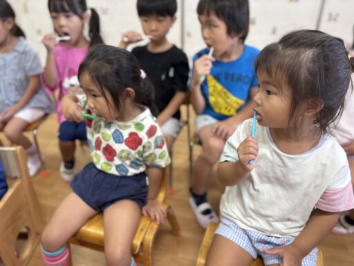 はじめての歯磨き指導に、ワクワクと緊張した様子の子どもたちでしたが、歯科衛生士さんの話を真剣に聞いていました。また、歯磨きの時にはライオンのパペットの動きを真似て、歯の1本1本を丁寧に磨いていましたよ🪥✨。うがいの順番待ちでは、『あ・い・う・べ体操』が始まり、歯科衛生士さんに褒められるくま組さんでした😊✌️。