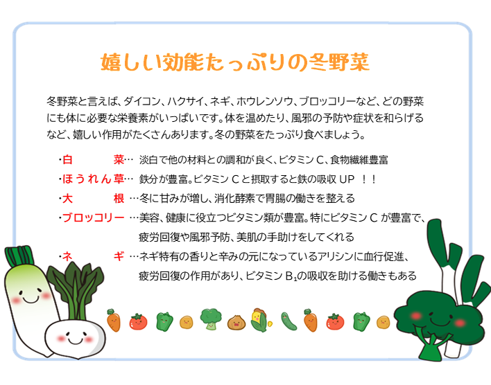 11月は秋から冬へ移り変わる時期です。朝晩は冷え込み、肌寒く感じます。芋類、果物、魚、きのこなどの季節の食材を食べて、寒さに負けない身体づくりをしましょう。