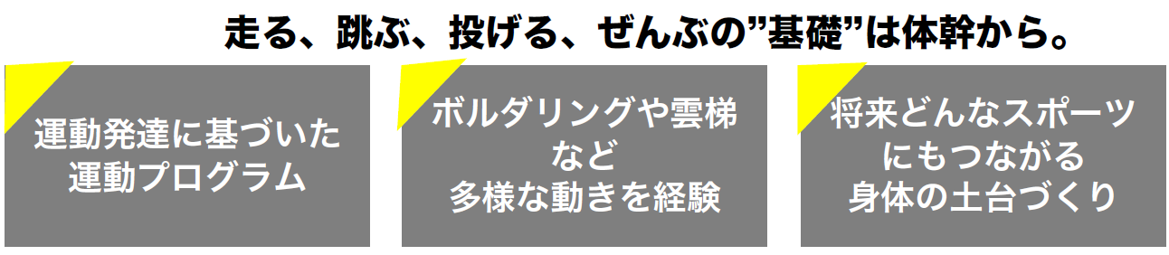 走る・跳ぶ・投げるといった運動の基礎となる体づくりを大切にしながら、さまざまな動きを経験できる内容となっています。