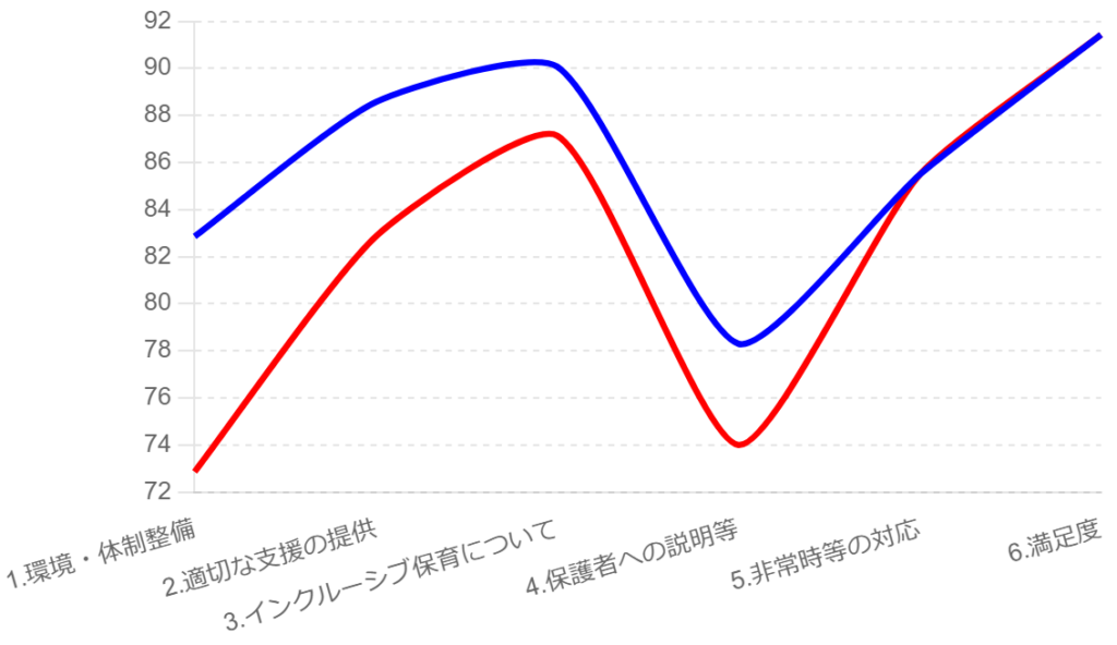 こちらも両者が高評価(利用者: 90.07、職員: 87.14)を付けています。インクルーシブ保育が適切に行われていることがわかります。