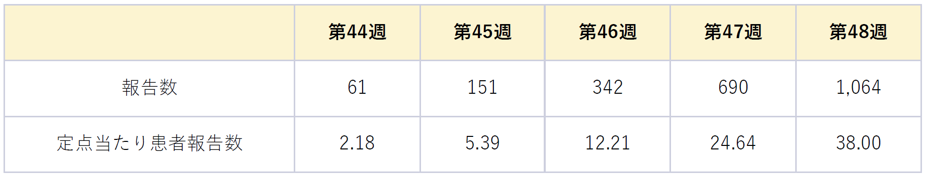 2025年第48週(11月24日~11月30日)の感染症発生動向調査において、定点医療機関あたりの患者報告数が38.00人となり、警報レベルの基準値(30)を上回っています。