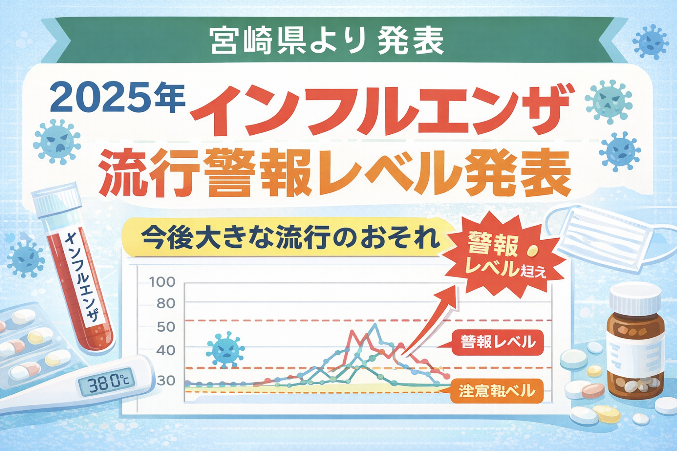 宮崎県より発表があり、県内のインフルエンザ患者数が「流行警報レベル」の開始基準を超えたとの報告がありました。